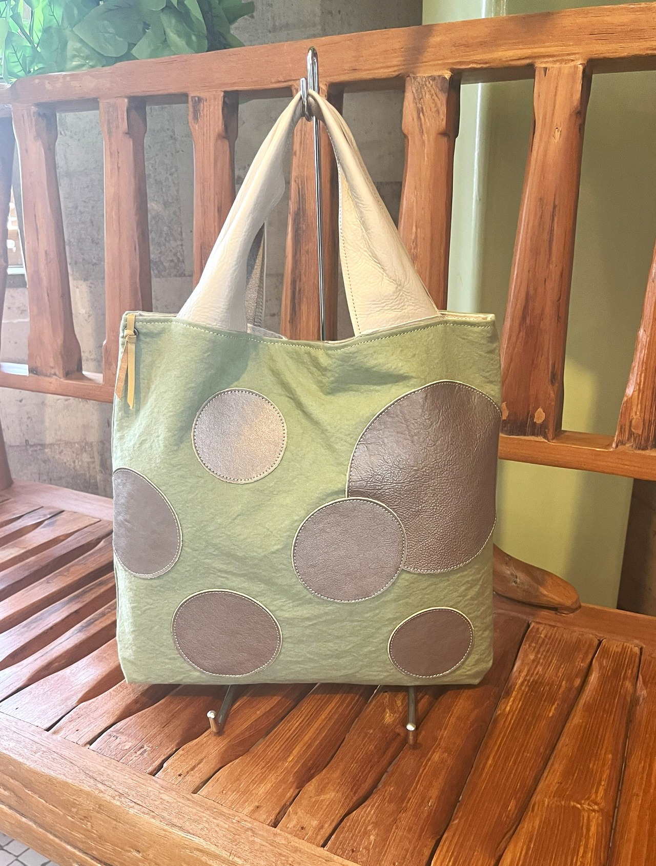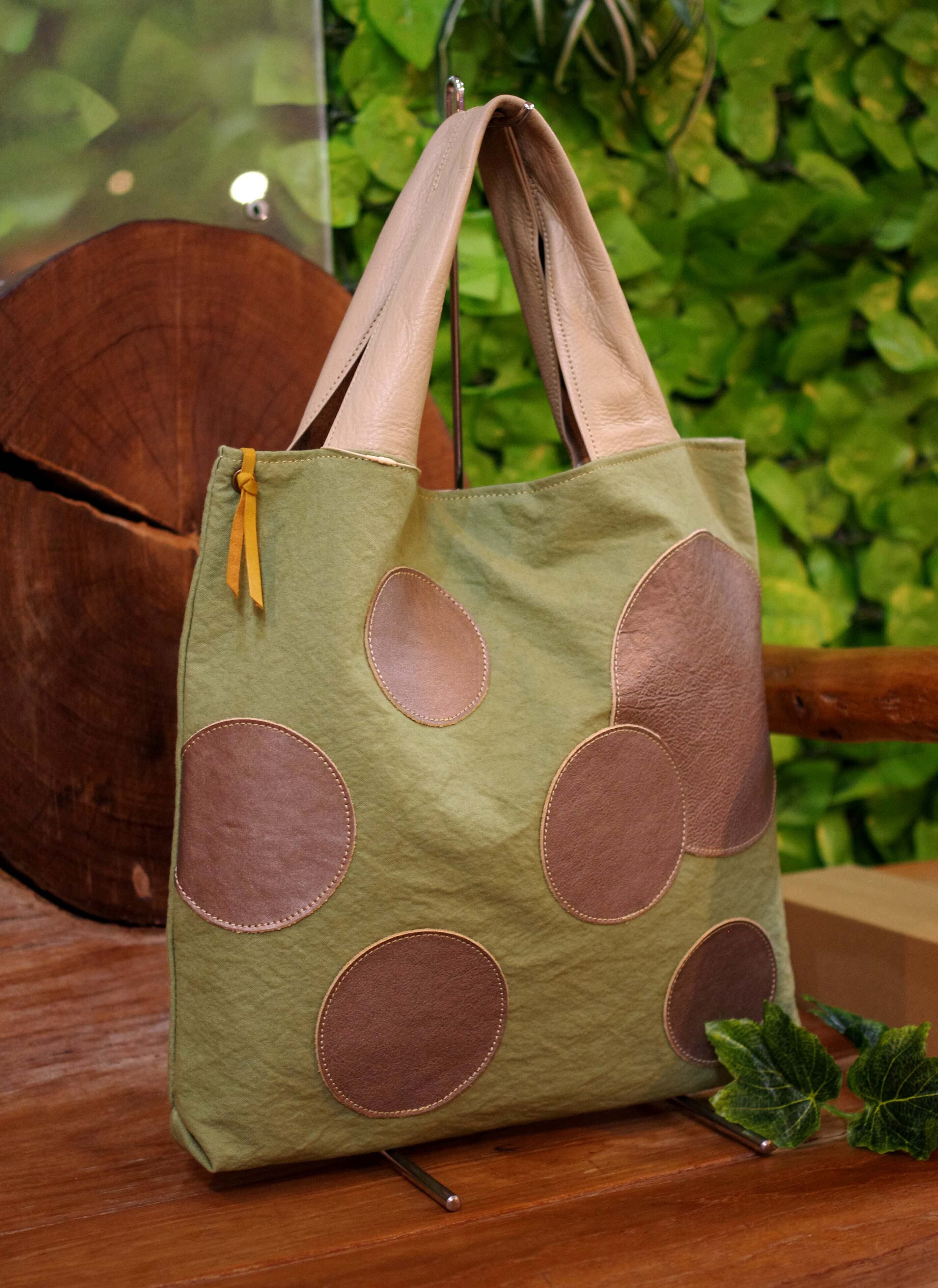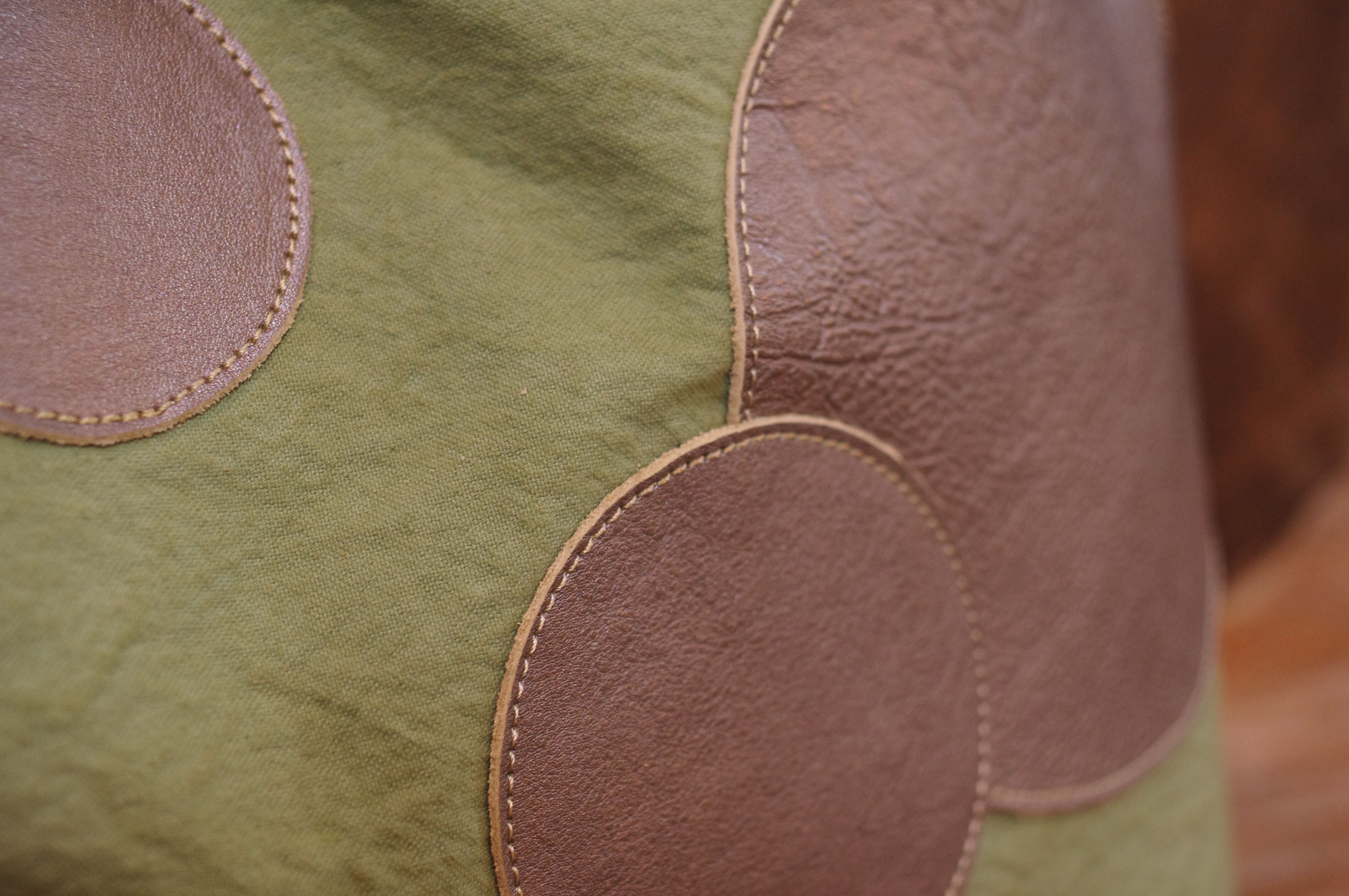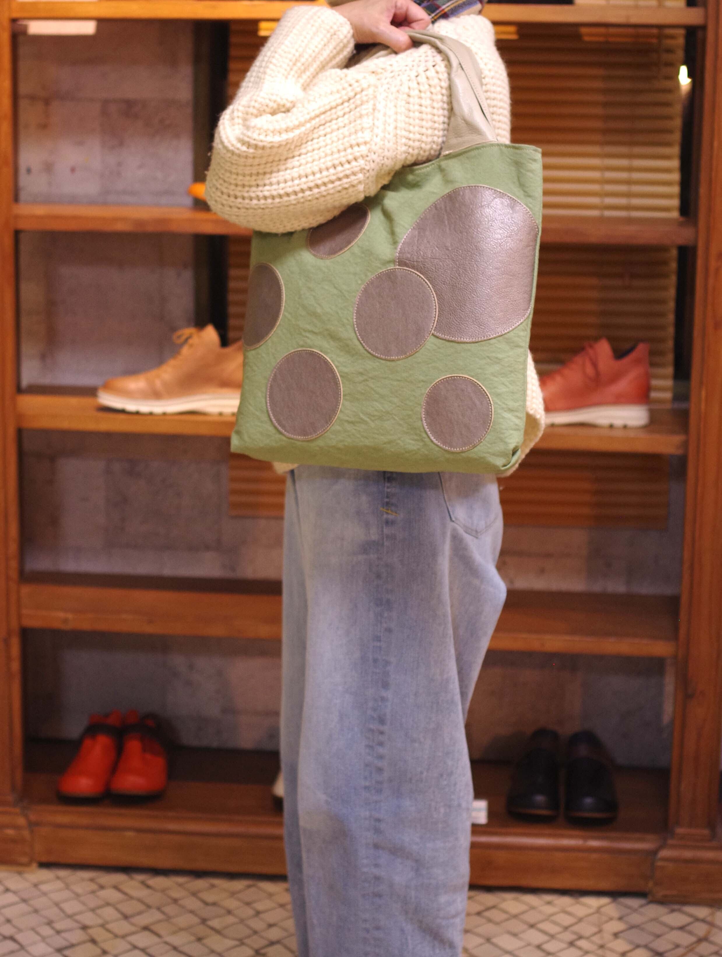 水玉模様が施された帆布素材と革の