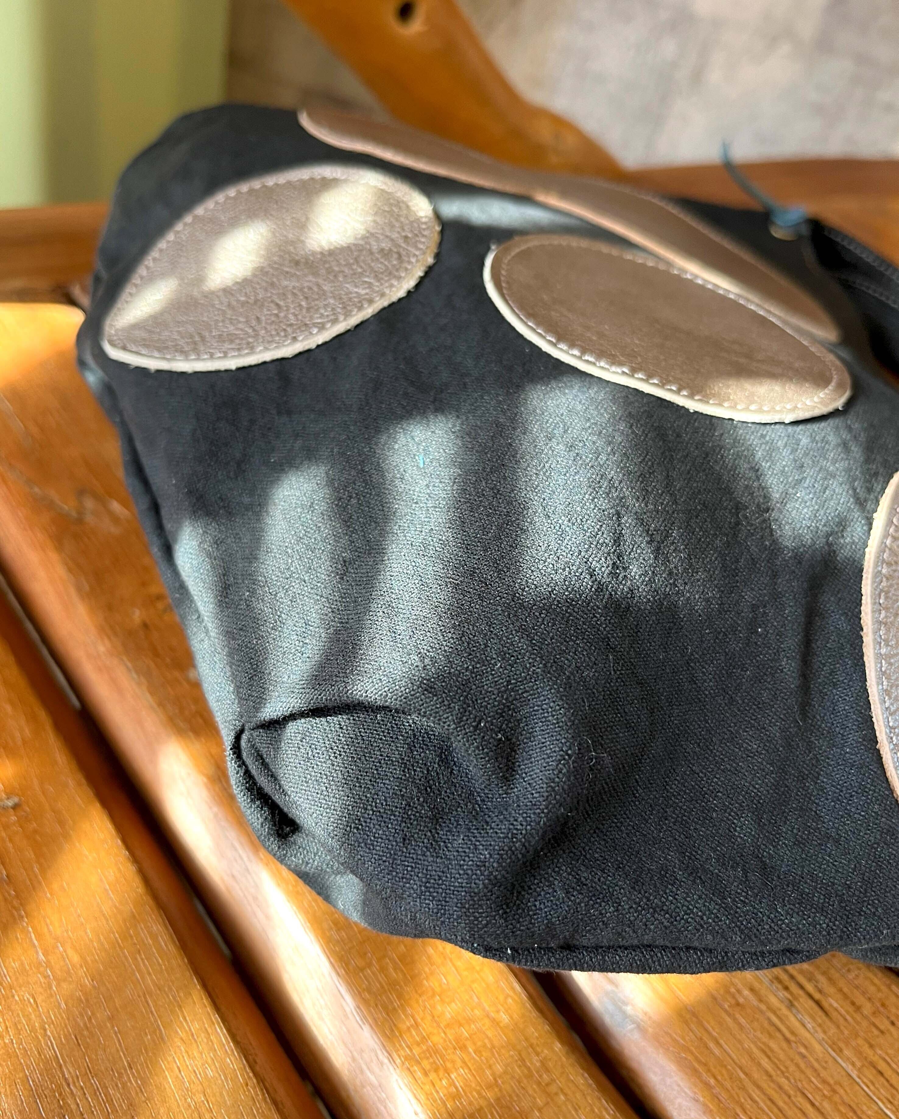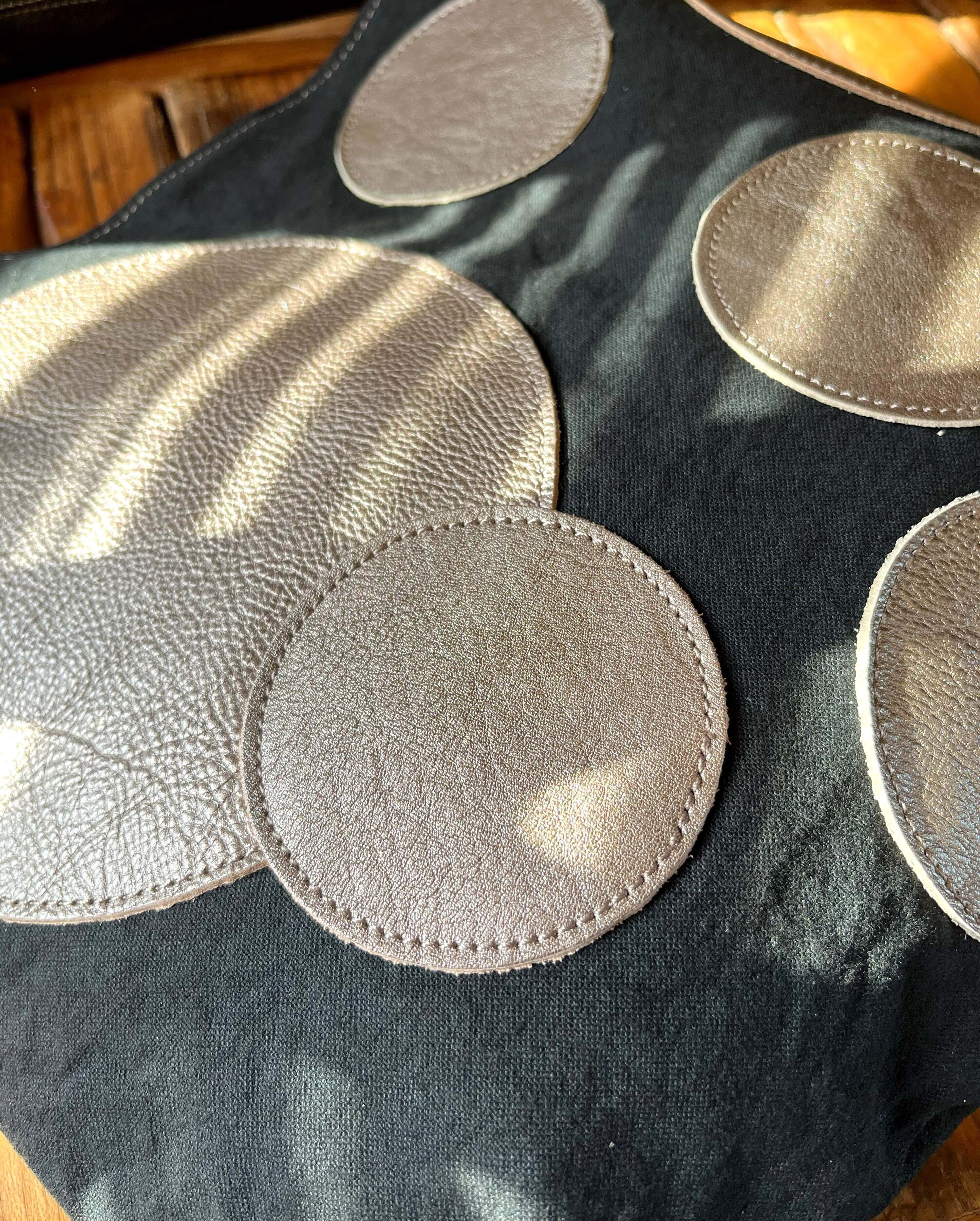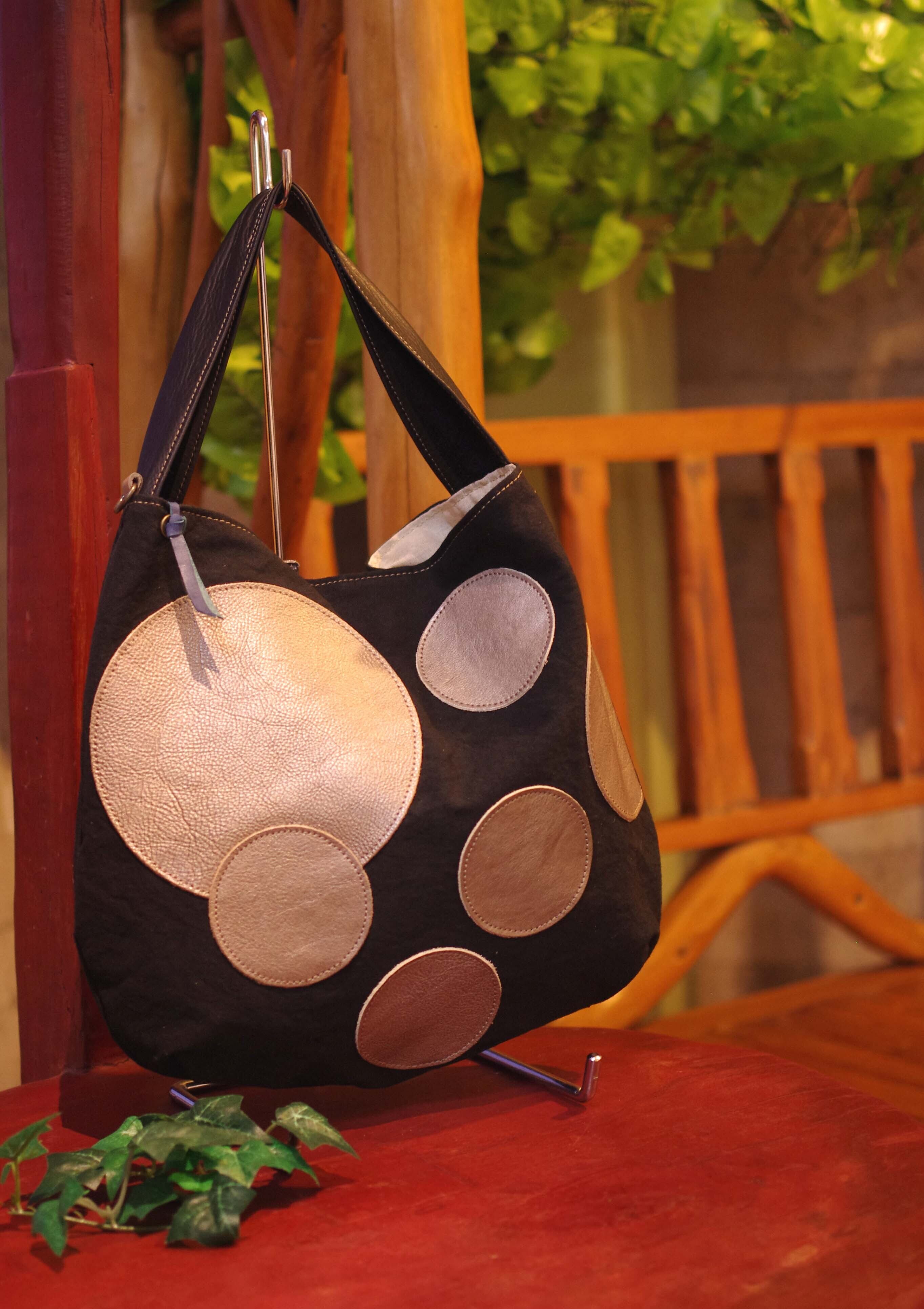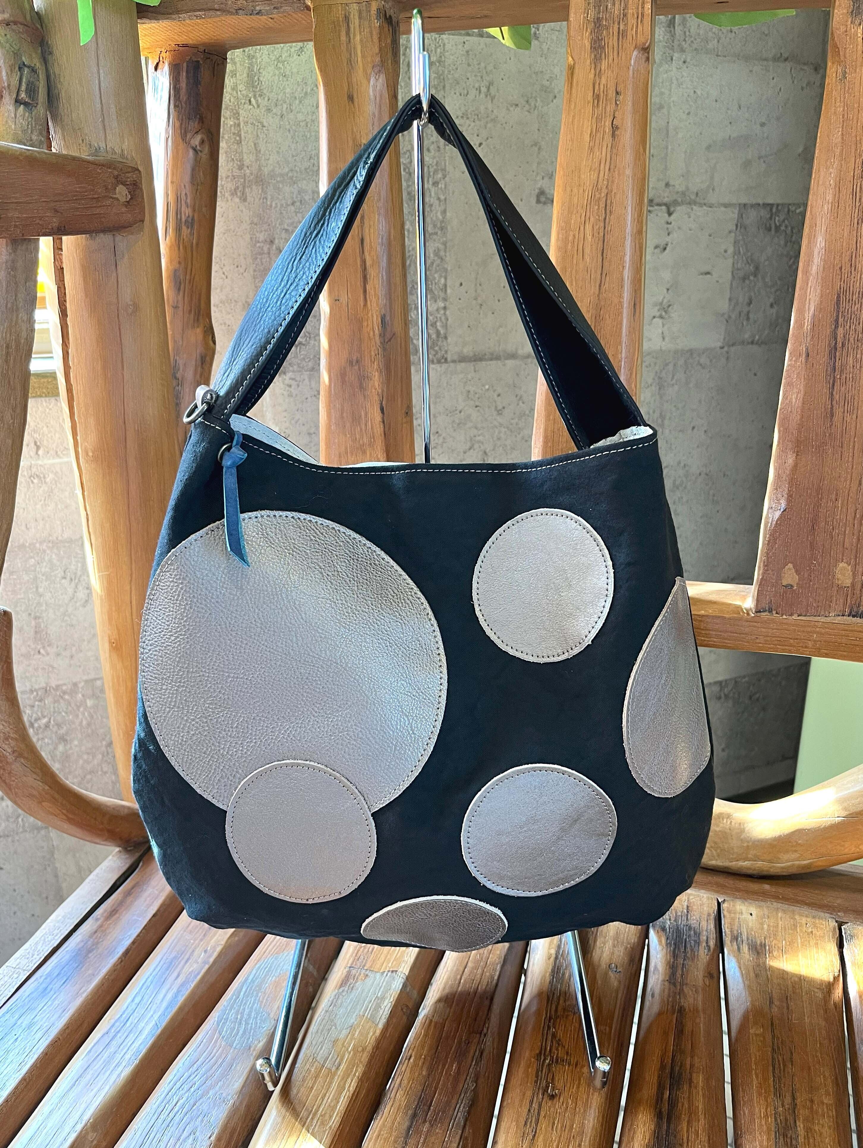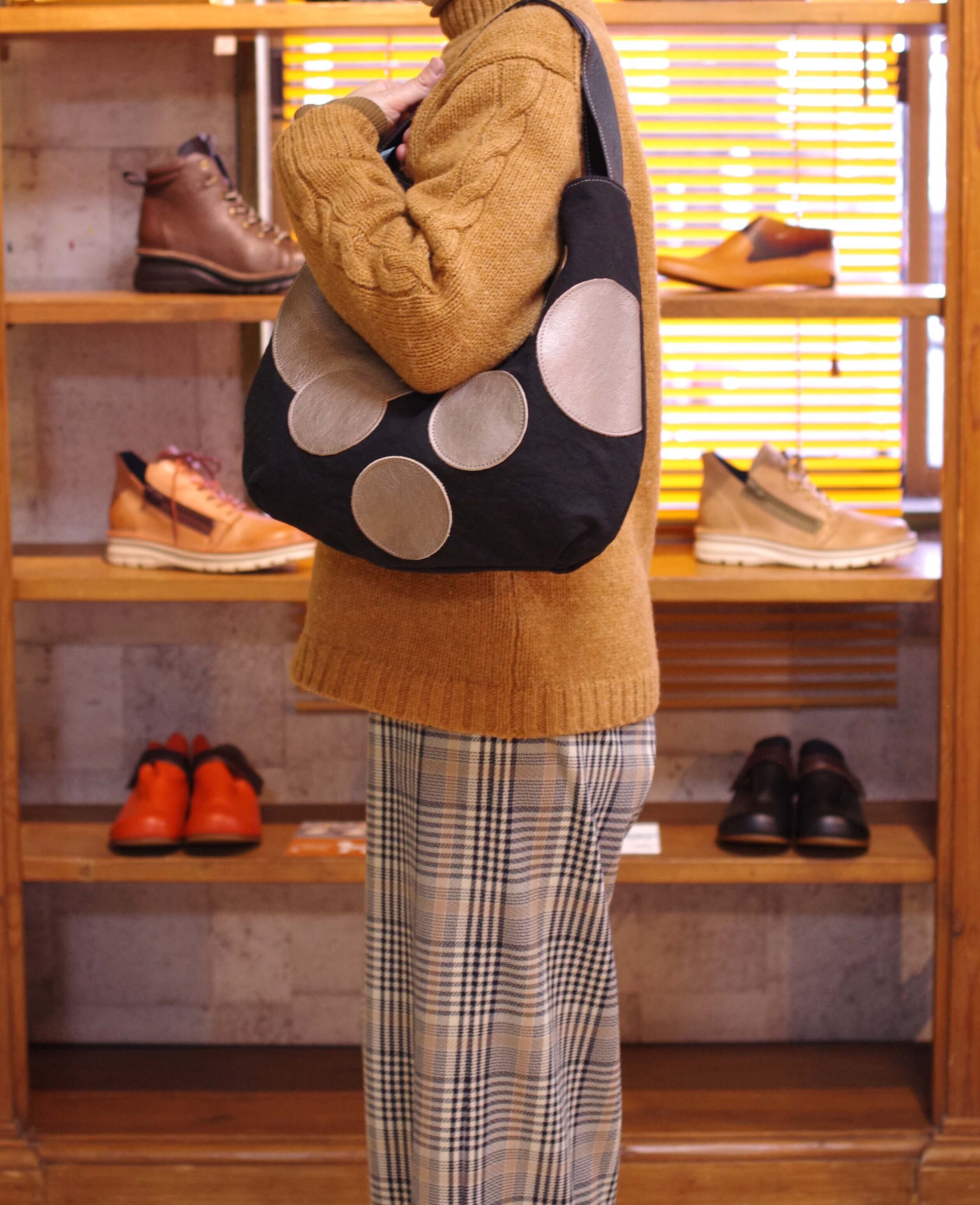 水玉模様が施された帆布素材と革の